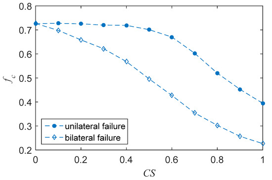 Relationship between collapse threshold fc and coupling strength (CS) on both unilateral and bilateral failure modes.