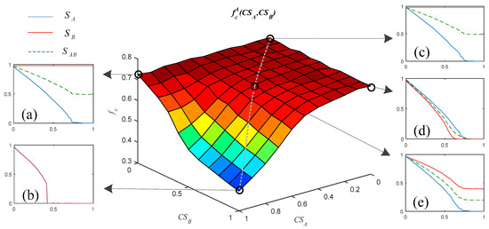 - If CSA = 1, CSB = 0 or CSA = 0, CSB = 1, one subnetwork is fully dependent on the other subnetwork through directed dependency links. The cascading failure of subnetworks and interdependent networks are shown in Figure 5a,d.