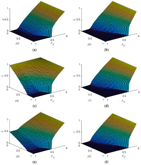 In the end, an interesting phenomenon was observed from the comparison between Figure 4 and Figure 8: the changes of collapse threshold fc in the partially interdependent and weakly interdependent models were consistent. The main reason is that the dependency link in interdependent networks serves as a failure propagator. Specifically, for double-layer no-feedback interdependent networks, where coupling strength is CSA = CSB = CS, dependency strength is DS. In the initial state, the failure probability of node in one subnetwork is p1, the failure probability of the node (resulted from the losing its dependency link) in the other subnetwork can be generated from: