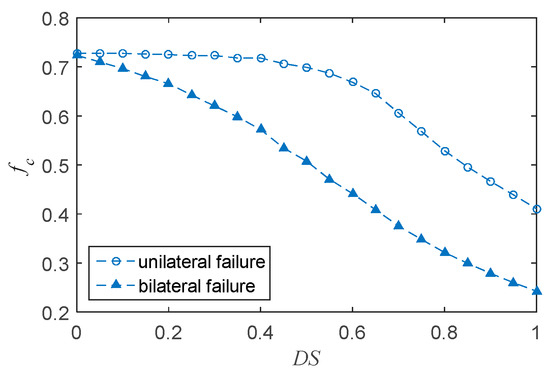 In addition, the results under bilateral failure in Figure 7d,e indicate that the cascading failures of subnetworks A and B were basically the same. The explanation of this situation is that failure nodes are distributed evenly in two subnetworks under bilateral failure, whereas only one subnetwork has failure nodes under unilateral failure mode. When DS increased to 0.5, the first-order percolation phenomenon appeared, which means that the influence of bilateral failure on the robustness was greater than unilateral failure.