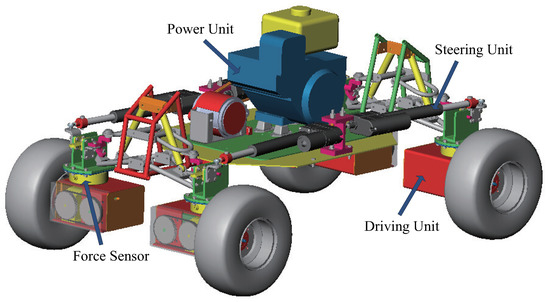 In each driving unit, the force sensor mounted on the wheel hub rotate with the wheel. Force measurement is in the direction of the steering angle. According to Figure 3, the dynamics of driving unit can be expressed by
