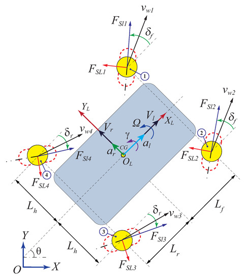For controller designing, a model of the vehicle under control is generally required to facilitate the selection of future control inputs. A dynamic model describes the states of the vehicle based on the forces applied. However, the development of a detailed vehicle dynamic model is always a challenging task due to the uncertainty of parameters and the complex disturbances from the external forces. The majority of existing control methodologies for 4WS4WD vehicles are proposed based on the linearized dynamic model, which lead to the loss of input degree of freedom [2,3]. Meanwhile, some other methods use nonlinear dynamic models in the control of 4WS4WD vehicles [4,5], where control inputs are subjected to some relationship constraints to simplify the controller design. However, in practice, the four independent wheels may interact with different terrain conditions, where different slip, wheel forces and terrain disturbances are generated on the corresponding contact patches. Hence, it is desirable to make four wheels individually controlled, thereby limiting and/or overcoming different slip and disturbance on different contact patch.