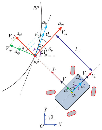 where and are, respectively, the reference longitudinal and lateral acceleration at point RP, measured in the direction and normal to the vehicle heading, and is the reference angular acceleration of the point RP.