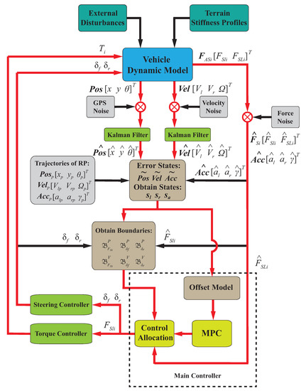 The working process of the vehicle control system is illustrated in Figure 6. The dashed box at the top shows the operation of the vehicle dynamic model. Based on the actual inputs (i.e., and ) as well as the vehicle velocity states , the tire model can generate the wheel forces, which is then used in driving unit model. The driving unit model considers the wheel inertia and gives the actual forces acting on the vehicle body. The dynamic states of the vehicle such as positions and velocities are simulated by running the proposed vehicle body dynamic model in Matlab (R2017a, MathWorks, Natick, MA, United States) using a Runge–Kutta method based solver with a time step of 8.33 s.