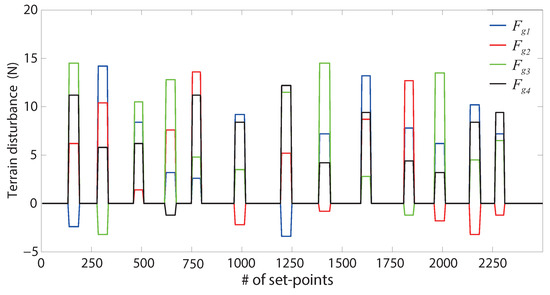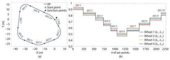 The PSO and MPC controllers are applied to drive the simulated vehicle to track the reference path shown in Figure 7a. In the simulation, the varying terrain conditions are considered to verify the validity and robustness of each controller. As presented in Figure 7b, the reference path is divided into ten sections, which have different tire stiffnesses and acting on each wheel. To simulate the terrain disturbances, the disturbances applied to all four wheels were always in the vehicle longitudinal direction. As shown in Figure 8, the disturbances are modeled as step signals and their magnitudes are generated randomly to show the uncertainties.
