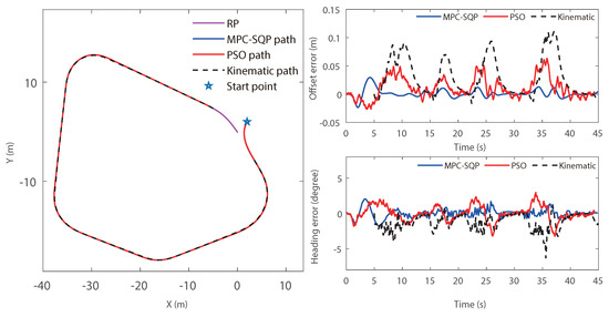 Figure 9 shows path tracking results by different controllers. The MPC-SQP controller has superior performance with offset error less than 3.2 cm, and heading error less than . The PSO controller has maximum offset error of 6.1 cm and heading error of . Both dynamic model based control methods perform better than the kinematic model based one in constraining the offset errors.