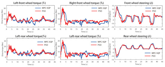 The drive torques and steering angles applied on four wheels are presented in Figure 10. At each cornering, the torques applied at the two outside wheels (i.e., and ) firstly increase and then decrease, which are contrary to that of the two inside wheels (i.e., and ). The difference in torques is used to compensate the insufficient angular accelerations of vehicle in corners. The steering angles of MPC-SQP and PSO controller follow the same varying trend in which steering curves of MPC-SQP show smoother variation. Thus, the MPC-SQP controller can provide more stable steerings compared with the PSO controller.