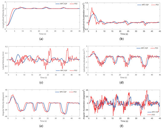 From the offset model, lateral velocity is undesirable as it causes tracking error. As shown in Figure 11c, both controllers maintain the lateral velocities fluctuating around zero. The MPC-SQP controller has a maximum lateral velocity of 0.08 m/s, whereas PSO has a maximum value of 0.17 m/s. The lateral velocities are well constrained, which provides higher accuracy of path tracking. The lateral acceleration curves follow the same varying trend in Figure 11d. It can be seen the PSO controller causes a lateral acceleration oscillation of 0.6 m/s relative to the MPC-SQP. The smoother change of lateral acceleration achieved by MPC-SQP controller reduces the jerk effect, decreasing the deviation from the reference path. The angular velocities are demonstrated in Figure 11e, in which the MPC-SQP has higher accuracy and a smoother manner, compared with that of the PSO. In Figure 11f, the angular acceleration curves are presented. MPC-SQP and PSO curves vary with oscillations of 12 °/s and 20 °/s, respectively. The undesirable oscillations are eliminated in the process of the integration, which can be demonstrated in Figure 11e. From all the acceleration plots given in Figure 11, the MPC-SQP controller performs better in constraining oscillations of accelerations, which provides better stability in vehicle motion control.