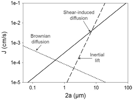 Flux versus the particle diameter for different migration mechanisms (Graph is reprinted from Separation and Purification Technology, 174, Karin Schroën; Anna van Dinther and Regine Stockmann, Particle migration in laminar shear fields: A new basis for large scale separation technology?, 372–388, 2017, with permission from Elsevier, original is from Davis [11]).