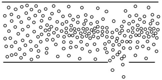 Considerable effort is put into understanding the principle of shear induced diffusion [12,13,14,15,16,17,18,19,20] that is especially relevant at high volume fractions and it causes particles to interact and move towards a region with low shear (i.e., the center of a channel) [21]. Depending on the size and volume fractions of small and large particles the former or latter will predominantly move towards the center of the channel when using particles of different sizes [19]. In a monodisperse suspension, the particles will concentrate near the center, which is a lead for novel concentration processes based on shear-induced diffusion when removing the particle-free liquid that is close to the wall (Figure 2) [16,17].