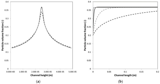 (a) Particle volume fraction versus the channel height and (b) the particle volume fraction in the center of the channel versus the channel length for different friction factors for both the drag and Shear induced diffusion (SID) force: for SID and for drag (black solid line); for both SID and drag (grey solid line); for both SID and drag (black dashed line); and, for SID and for drag (grey dashed line)