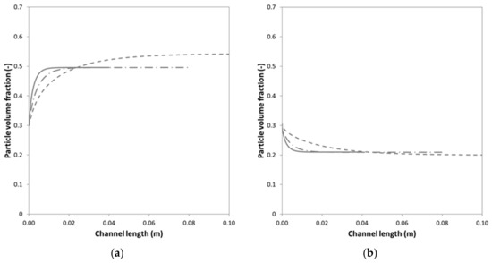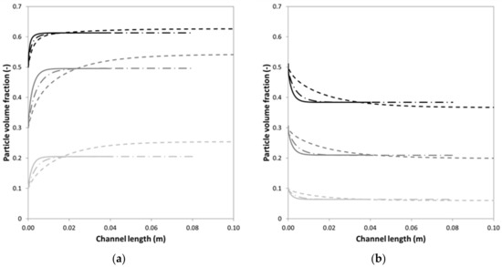 (a) Particle volume fraction versus the channel length at the channel centerline and (b) at 10% from the wall. Results are shown for three different bulk particle volume fractions: 0.1 (light grey); 0.3 (dark grey); 0.5 (black) and for the cases as given in Table 4: case 1 (solid line); case 2 (dashed line); case 3 (dashed-dotted line); and, case 4 (dotted line). Note, case 1 and 4 overlap.