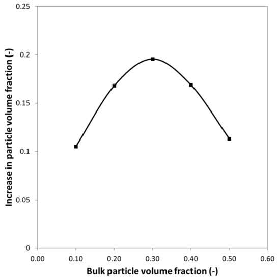 Increase in particle volume fraction at the center versus the bulk particle volume fraction for fully developed profiles for case 4 given in Table 4.