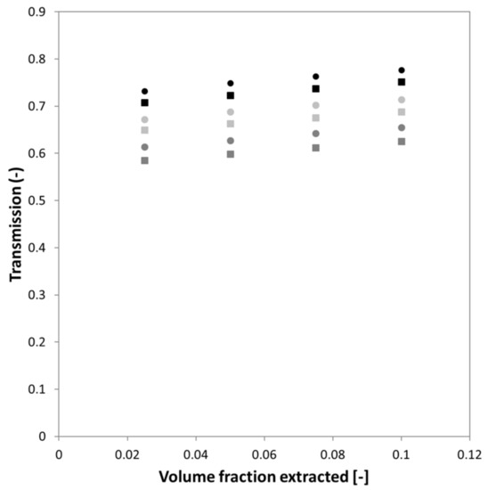 With the particle mass flux (kg/m2/s). The results are shown in Figure 9 for two different channel heights and for permeate volumes that are between 2.5 and 10% of the feed, which are realistic values for membrane processes (albeit that for a single pore these are impressive amounts). The transmission ranges from 59% to 78% for different channel heights and particle concentrations in the feed. For higher channels, the transmission will be slightly lower, which is consistent with the findings that are discussed in Section 3.1.2. At high feed volume fraction, the concentration in the center of the channel is close to the maximum packing density, and therefore relatively more particles will be present near the wall. This results in a higher transmission, as was also expected based on the results that are shown in Figure 6.