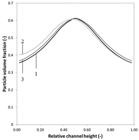 Particle volume fraction versus the relative channel height. The graph gives an indication of the shift in the SID profile of a suspension with a 50% bulk particle volume fraction: fully developed SID profile before the pore at 9.5 cm (black line, 1); disturbed SID profile just after the pore at ~10 cm (light grey line, 2) and the restored SID profile after the pore at 19.5 cm (dark grey line, 3).