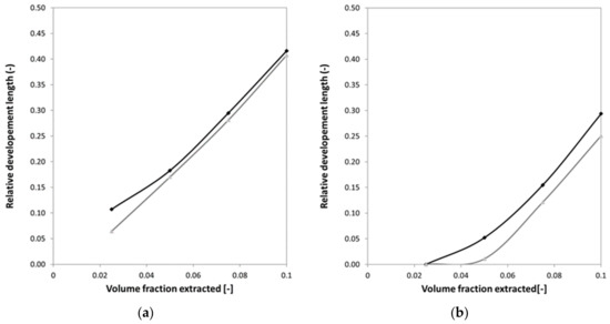 Relative development length at the center of the channel (95%) between the recover section and the entrance section versus the volume fraction extracted from the inlet for a bulk particle volume fraction of 10% (a) and 30% (b). Each graph shows two different lines for the different channel heights: 50 µm (black) and 100 µm (grey).