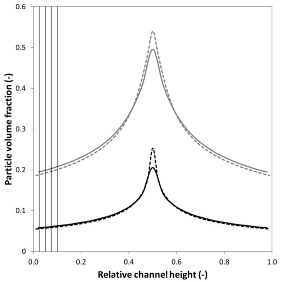 Relative particle volume fraction versus the relative channel height at a fully developed profile before the porous region for two different bulk particle volume fractions: 10% (black) and 30% (grey) and two different channel heights: 50 µm (solid line) and 100 µm (dashed line). Vertical lines indicate the amount of volume extracted, from left to right: 2.5%, 5%, 7.5%, and 10%.