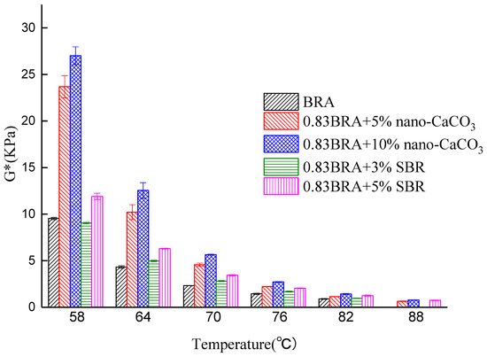 The dynamic shear rheometer (DSR) test was implemented to qualify the high temperature performance of nano-CaCO3/BRA and SBR/BRA compound-modified asphalt. The results of dynamic shear rheometer (DSR) tests before the aging of nano-CaCO3/BRA and SBR/BRA compound-modified asphalts with different contents are shown in Figure 2, Figure 3 and Figure 4, respectively.