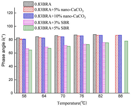 As can be observed from Figure 3, under the same temperature conditions, the phase angle δ of the 5% SBR/BRA compound-modified asphalt is the smallest, and that of the BRA is the largest. This shows that the addition of nano-CaCO3 and SBR can improve the elastic composition of the BRA, and the 5% SBR/BRA compound-modified asphalt is the most likely to restore deformation compared with the other four kinds of modified asphalt.