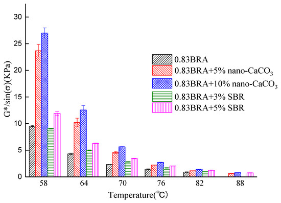 It can be observed from Figure 4 that at the same temperature, the anti-rutting factors G*/sinδ of the four kinds of BRA compound-modified asphalt are larger than that of BRA at the same temperature, and the rutting resistance of 10% nano-CaCO3/BRA compound-modified asphalt is the best. The failure temperature of 10% nano-CaCO3/BRA and 5% SBR/BRA compound-modified asphalts reached 88 °C, which is a temperature grade higher than the failure temperature of 82 °C. It shows that the high temperature properties of nano-CaCO3/BRA, SBR/BRA compound-modified asphalt, and anti-rutting performance are more superior to those of BRA.