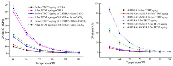 The relationship between Nano-CaCO3/BRA and SBR/BRA compound-modified asphalt in before and after thin film oven test (TFOT) aging anti-rutting factors (G*/sinδ) and temperature.