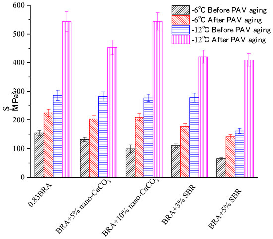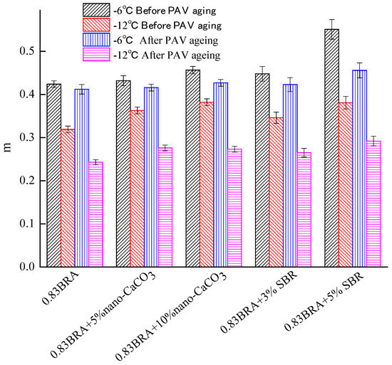 The samples of SBR/BRA and nano-CaCO3/BRA compound-modified asphalt with different content were tested with the bending beam rheometer (BBR), and test temperatures of −6 °C and −12 °C were adopted and compared with those before aging. The creep stiffness S and the creep slope m value of SBR/ BRA and nano-CaCO3/BRA compound-modified asphalts were compared before and after pressure aging vessel (PAV) aging, as shown in Figure 6 and Figure 7.
