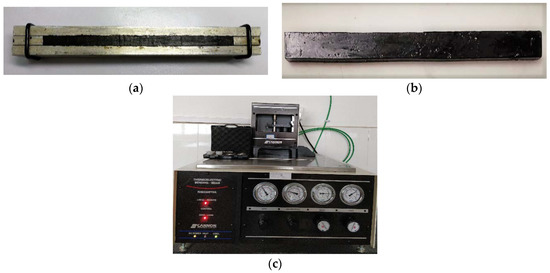Thermoelectric bending beam rheometer (BBR) and specimen: (a) metal die of BBR; (b) asphalt beam of BBR; (c) thermoelectric bending beam rheometer.