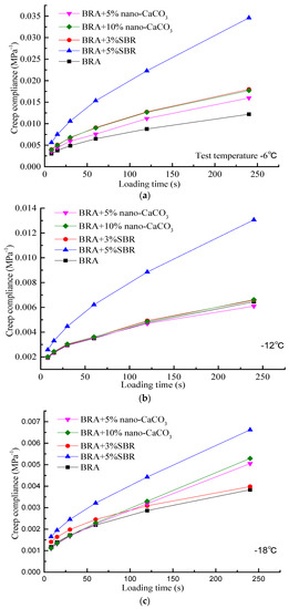 The curves of creep compliance of BRA compound-modified asphalt in −6 °C, −12 °C, and −18 °C are shown in Figure 9. From analyzing the creep compliance in Figure 9, conclusions can be drawn as below: