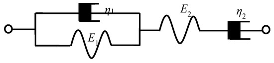To obtain the viscoelastic characteristics for asphalt, Burgers’ model was used in many research studies. Lots of studies have demonstrated that asphalt is a viscoelastic fluid material, so asphalt’s elasticity, viscoelasticity and flow limitation should be considered when the mechanical characteristics of asphalt are analyzed. Burgers’ model is a viscoelastic model that is suitable for analyzing asphalt’s rheological behavior. Burgers’ model is made up of the Maxwell model and the Kelvin model, and is successfully applied to the viscoelastic analysis of asphalt and asphalt mixtures [32,33,34,35].