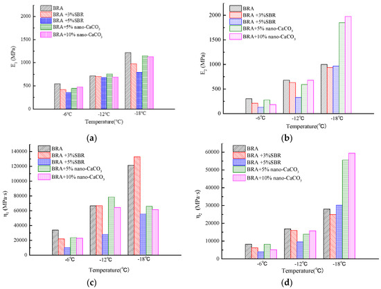 - As shown in Figure 11a,b,d, the viscoelastic parameters (E1, E2 and η2) of BRA compound-modified asphalt increased as the temperature decreased, which indicated that the low-temperature performance of the material decreased. Among the viscoelastic parameters, E2 and η2 had the same change trend as the temperature decreased, so both have good correlation with each other.