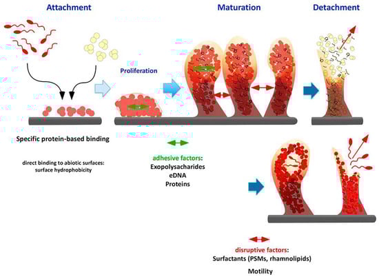 Concerning formation, schematized in Figure 1, the first step is adherence to a surface. It can be mediated both by non-specific factors, like physico-chemical factors, as well as by specific bacterial protein components. The former mainly involves on one side the nature of the bacterial cell-wall and superficial proteins and on the other the hydrophobicity of the surface, as analyzed in different bacterial species, like Staphylococcus aureus (Gram-positive) [] and Pseudomonas aeruginosa (Gram-negative) [,]. In these cases, interaction of cell wall components, surfaces proteins and cellular protrusions have been reported to play a role in the attachment to a surface. However, the contribution of single components of the bacterial surface is still debatable, especially due to the methods of analysis and their relevance in in vivo conditions []. Another relevant physical factor recognized to be important for biofilm formation is shear stress that allows the formation of a much stronger biofilm when it is applied during formation of the community and influences the dispersal process, increasing the chance to disseminate the infection. Many works established the influence of this physical factor on biofilm [,,,], including also natural biofilm in rivers in which a particular form of biofilm microcolonies, termed streamers, are aligned to the flow with a sessile “head” and a flowing unattached “tail” []. Recently, the molecular basis of mechanosensing of shear was clarified in P. aeruginosa, further underlining the relevance of this physical factor []. Regarding in vivo conditions, upon interaction with body fluids, any surface becomes covered with ExtraCellular Matrix (ECM) components, thus coating the surface. The case of S. aureus Cell Wall Anchored (CWA) proteins details the specific adhesion to defined ECM molecules. Fibrinogen [,], fibronectin [,] and collagen [,] are the ligands of specific staphylococcal proteins that have been extensively studied and recently re-classified according to their structure []. Even specific biofilm-associated proteins have been reported []. These proteins have been substantially shown to bind to their respective ligand and thus promoting specific adherence to a coated surface. Similar cases are reported for Gram-negative bacteria []. These specific interactions provide a more realistic base for the first step of biofilm formation in medically relevant conditions.