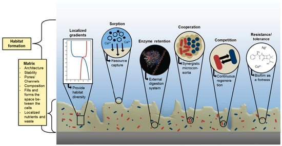 The highly heterogeneous nature of EPS provides bacterial communities with many characteristics that influence their behavior and allows the formation of a peculiar microenvironment in which they can better survive and cooperate, as shown in Figure 2.