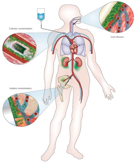 As reported in Figure 3, the main sites of initial infections are either sites where medical manipulation occurred (prosthesis or catheter implantation) or areas where bacteria can gain easy access to bloodstream (periodontal or “gum” disease—as previously said, dental plaque is a form of biofilm–). The contamination at these sites enables access to bloodstream, that allows dispersion of single cells or biofilm clumps in the entire body, therefore reaching even deeper tissues (e.g., endocarditis). The adherence to a substratum and its localization in a specific site (with sporadic bacteremia) are among the four characteristics that Parsek and Singh proposed for biofilm-related infectious diseases []. The other two features are presence of a matrix-embedded biofilm upon microscopic observation and increased resistance to antibiotics despite antibiotic sensitivity of the constituent planktonic organisms. The latter is particularly relevant since it claims for alternative or complementary approaches for the reduction of the infection burden, since in many cases infection persists even after long-term aggressive antibiotic therapy, after which prosthesis or implant removal is necessary []. This implies higher costs in many different aspects, both from the patient side and the healthcare providers.