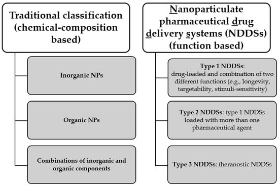 Two different classifications of nanoparticles (NPs), based on their chemical composition or on their function. NDDSs classification has been proposed by Torchilin [].