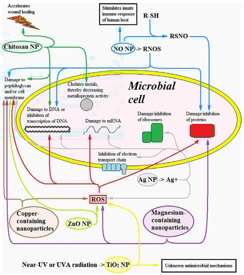 Damages caused to the bacterial cell by different types of nanoparticles (NPs). Reactive Nitrogen Oxide Species (RNOS). Reactive Oxygen Species (ROS). R-SH schematizes a compound with a thiol (SH) group. RSNO stands for S-nitrosothiol. (With permission, from []).