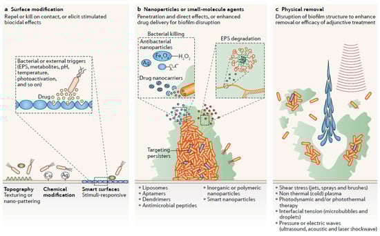 Anti- biofilm strategies based on nanotechnological applications: (a) Modification of the surface , either topography or linkage with metal or stimuli-sensitive nanoparticles; (b) Direct contact between various types of nanoparticles and biofilm; (c) Physical methods to disperse biofilm coupled to nanotechnological improvement (With permission, from []).