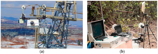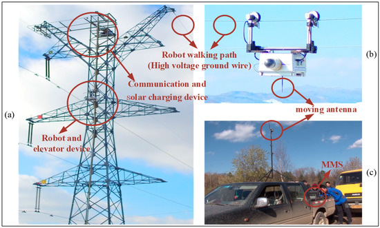 Inspection robot project running in Jilin, 2016–2017. (a) Power tower and additional device; (b) Inspection robot; (c) Mobile Monitoring Station (MMS).