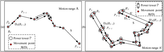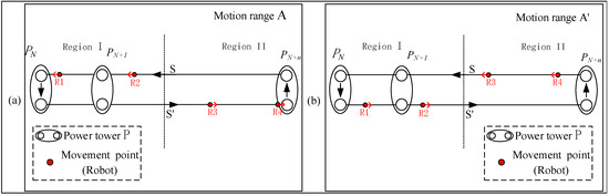 In the network model, the simplified robot movement rule is shown in Figure 4. The robot moves along the ground wire between power towers. It will maintain a rest or uniform motion between the towers of N to N + n (n, N ∈ N*). When the robot is crossing the tower, it will walk at a low speed for obstacle climbing. Its movement model is consistent with the Random Waypoint [31], but the motion is along the power line. In order to identify the more-accurate kinematic relationship of the network, this paper introduces Path-constraint Random Waypoint (PRW), Bidirectional Path-constraint Random Waypoint (BPRW) and the new movement rules.