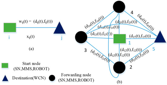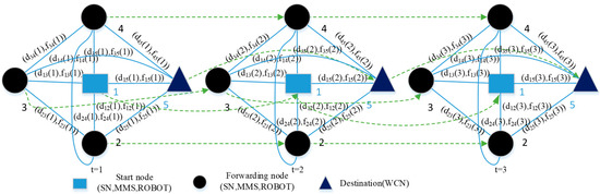 For RDTSN, as robots walk randomly along transmission lines, the network topology is unreliable and constantly changing. Furthermore, as the robots have high mobility, the entire network is locally strongly interconnected at discrete times. In order to meet the needs of the nodes (Inspection Robots, SNs or MMS) in RDTSN to transmit information to the CMP via the WCNs connected with OPGW, this paper draws on references [14,32], to introduce the graph theory to mathematically describe the above network. In the mathematical model, each link has an availability weight, which is jointly determined by link delivery probability and energy loss. The availability weights of links can change momentarily. Furthermore, the node will determine whether to send or store the message according to the weight of the link. Therefore, this paper proposes a discrete-time multi-path selection model with maximum link weights and maximum information at different time, as shown in Figure 6.