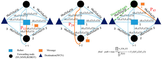 In RDTSN, a special scene is identified, as described in Figure 8. A number of WSNs are deployed in the network, leading to the formation of many homogeneity wireless destinations. In the process of message delivery, the transmission paths of different endpoints need to be compared, and the best destination is determined. Unlike common routing algorithms, DTMA is allowed to change the message destination. The determination of the message’s ultimate destination usually occurs at t = 3 in Figure 8. At this point, the message transmission paths of different endpoints are compared based on the method described above. The message is sent to the best path to satisfy the objective function and constraint conditions. Finally, the node independently completes the optimization of the message destination.