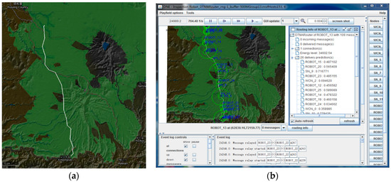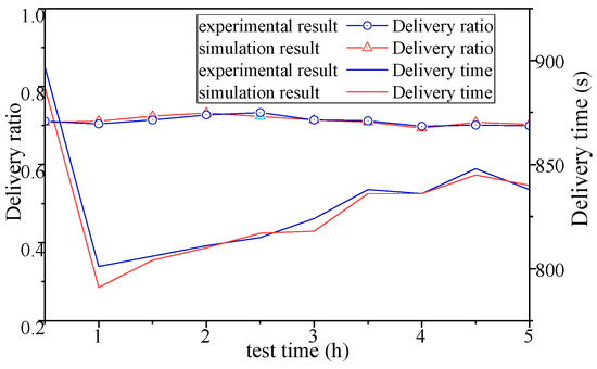 DTMA is tested in a field experiment lasting 5 h. During the experiment, two robots are running on two ground wires respectively. The parameters of the test are shown in Table 9. In the process of experiment, MMS, robots and other nodes can establish effective communication with each other. The results of the experiment and the simulation are shown in Figure 34. The results of the field experiment are highly similar to those of simulation, which proves that the simulation can well reflect the performance of network and can act as a reference for comparison.
