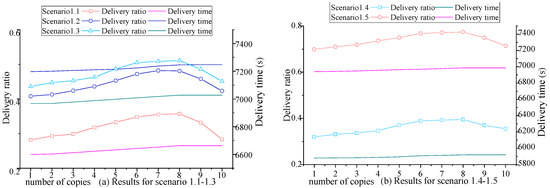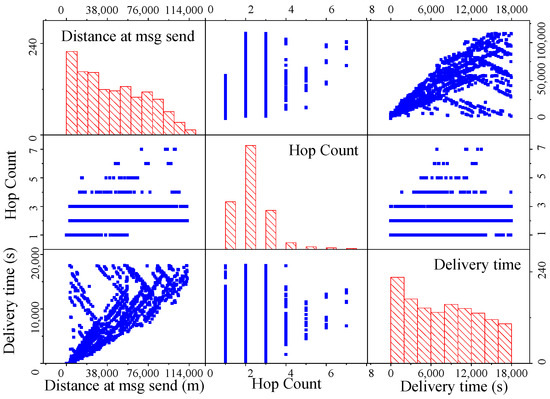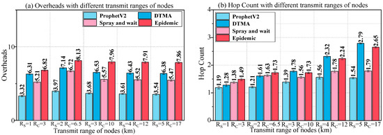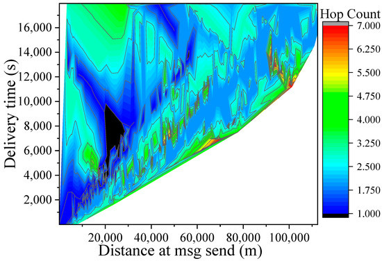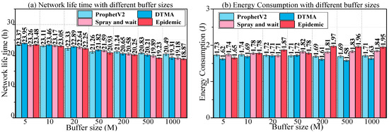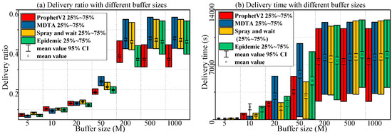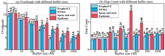 For all protocols, increasing buffer size can affect the update rate of messaging. In particular, an excessively small buffer size can significantly accelerate the message update rate, resulting in the discard of a large number of delayed messages. This process allows messages to be delivered in a real-time manner, as shown in Figure 18, where the values of message delay and delivery rate are both maintained at very low levels. When buffer size is large enough, such as over 500 M in Scenario 2, as shown in Figure 18, Figure 19 and Figure 20, since all message updates are not limited by buffer size, all policy performances tend to be stable. Under this situation, the performance of each algorithm is more dependent on the change in the probability of node encounters.
