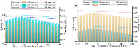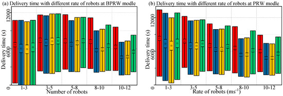 Results of Scenario 3, Delivery time with different rate of robots. (a) BPRW movement model; (b) PRW movement model.