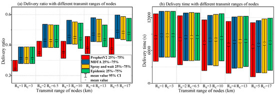 Adjusting transmission ranges or robot rate means changing the probability of node encounters. For all protocols, the message delivery ratio will increase as the nodes meet frequently. However, Prophet V2 performs the worst, as it is impossible to accurately describe the relationship among the network changes in RDTSN. As the large number of copies can clog the network, the growth of Epidemic’s delivery rate is also limited. Spray and Wait adopts the mechanism of restricting the number of copies, which determines its better performance in delivery ratio. The proposed DTMA considers the link availability that uses the calculation of the signal strength, which enhances the performance of message delivery. The best delivery performance is achieved in the simulation. The increase in the probability of node encounters also has a significant improvement in delivery time.