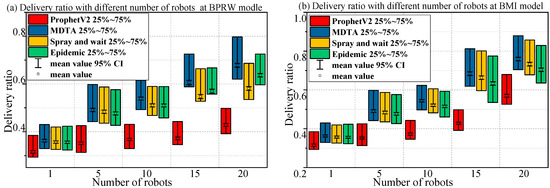 Results of Scenario 3, Delivery ratio with different number of robots. (a) BPRW movement model; (b) BMI movement model.