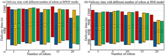 Results of Scenario 3, Delivery time with different number of robots. (a) BPRW movement model; (b) BMI movement model.