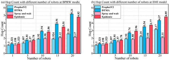 Results of Scenario 3, Hop count with different number of robots. (a) BPRW movement model; (b) BMI movement model.