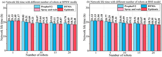 Results of Scenario 3, Network life time with different number of robots. (a) BPRW movement model; (b) BMI movement model.