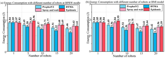 Results of Scenario 3, Energy consumption with different number of robots. (a) BPRW movement model; (b) BMI movement model.