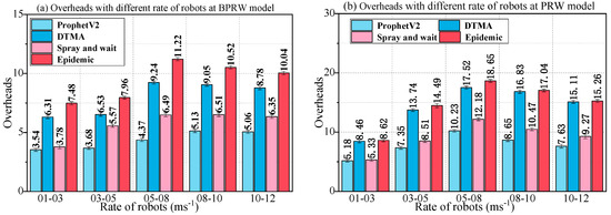 Results of Scenario 3, Overheads with different rate of robots. (a) BPRW movement model; (b) PRW movement model.